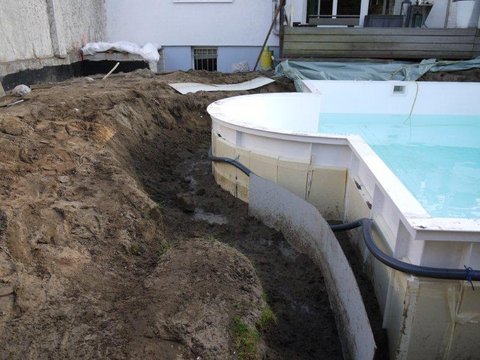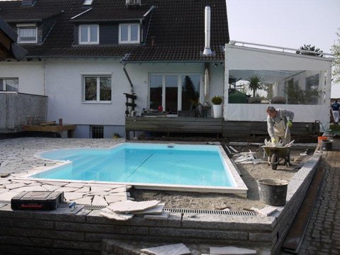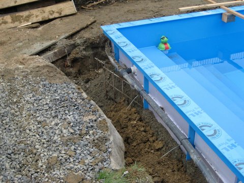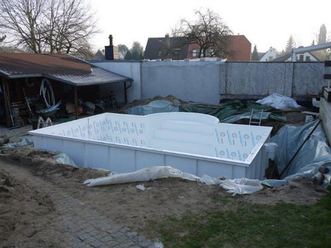 Bei Bedarf das Becken zur Wärmedämmung noch mit 2cm starken Styrodurplatten verkleiden. Nun das Becken verschalen, fertig. Das Becken muss nicht wie in den Bildern abgebildet mit Beckenrandsteinen verkleidet werden. Dies sind nur Beispiele. Unsere Becken haben auch einen sehr schönen Anschlussrand, wie in der Galerie zu sehen ist.