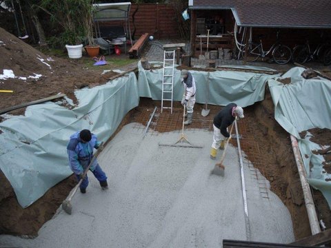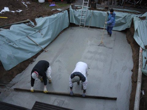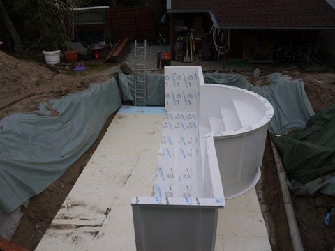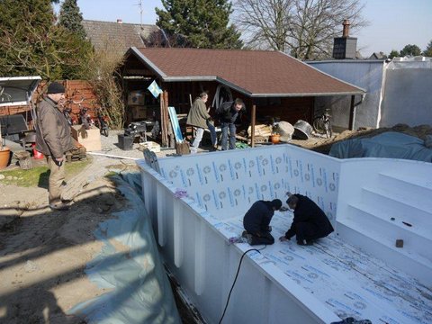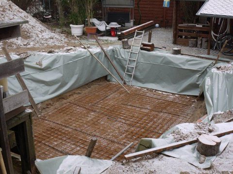 Nun kann die Bodenplatte, wenn sie getrocknet ist, noch mit 2cm Styrodurplatten(nicht im Lieferumfang enthalten) als Dämmung auslegt werden. Damit keine kleinen Steinchen etc. unter dem Becken liegen, muss die Bodenplatte vor der Montage gründlich gesäubert werden.
